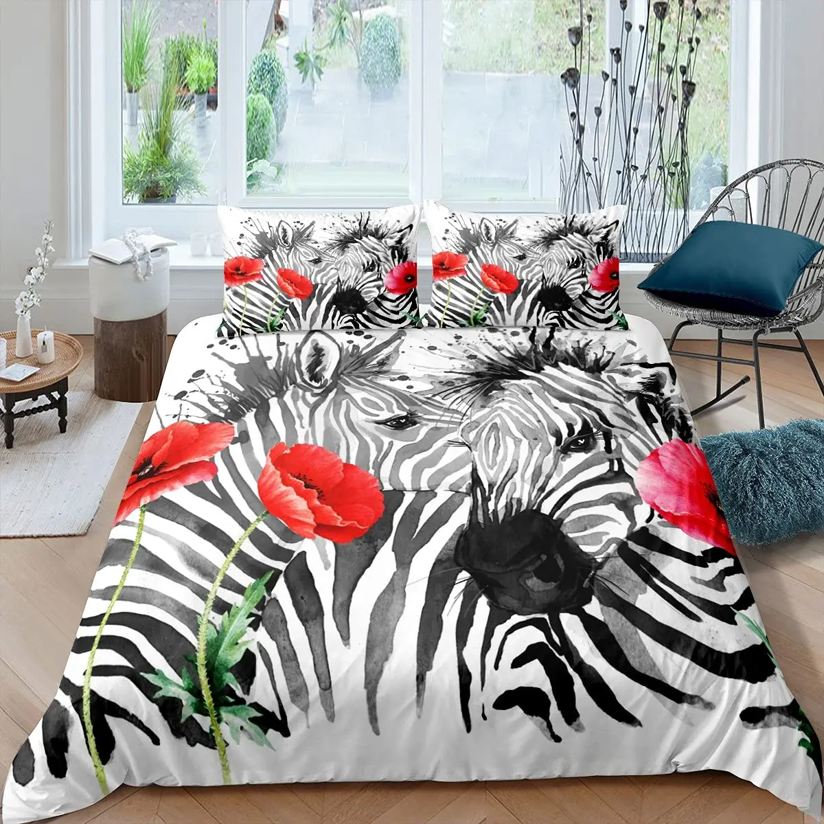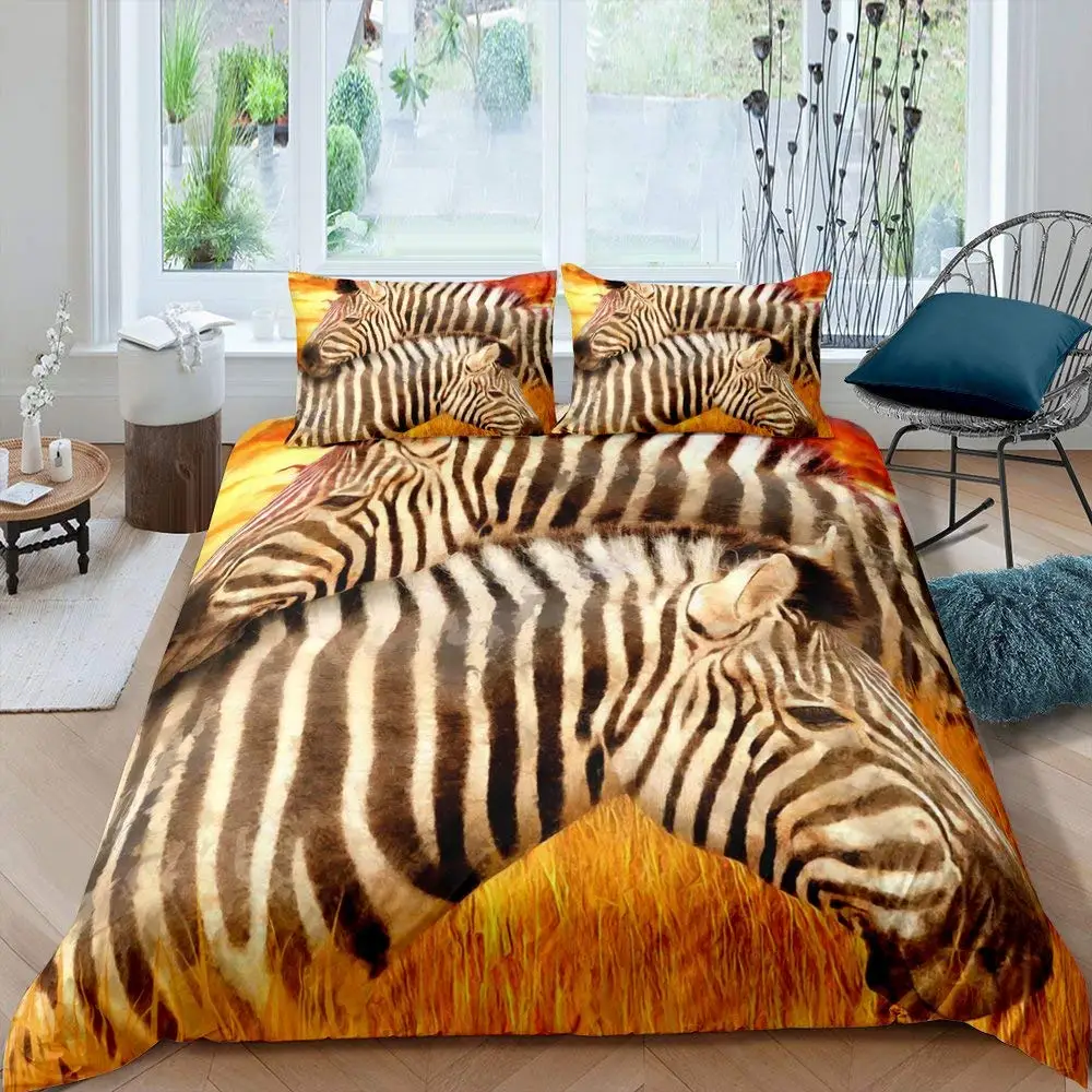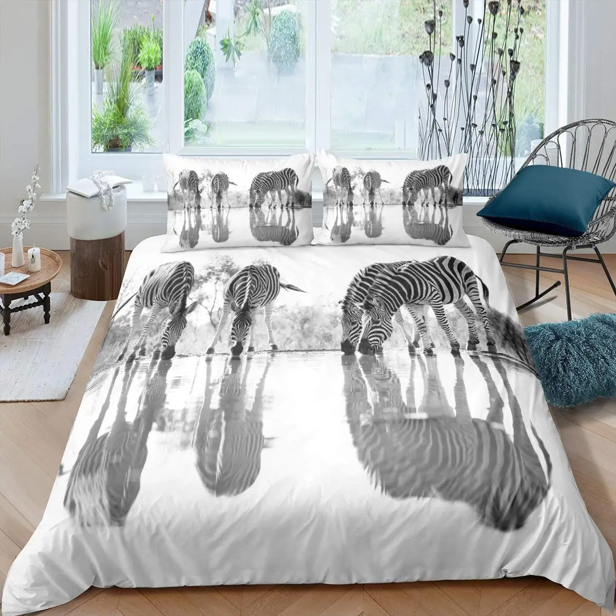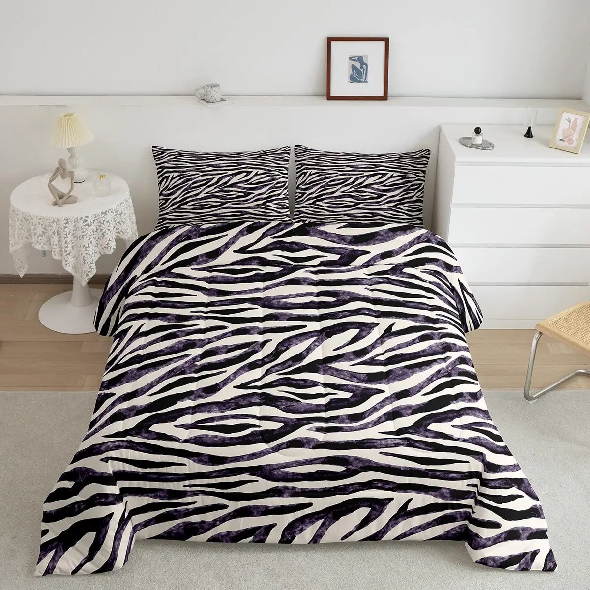 Zebra Print Bedding Set, Striped Zebra Animal Print Decorative Quilted 3 Piece Comforter Cover with 2 Pillow Shams, King Size