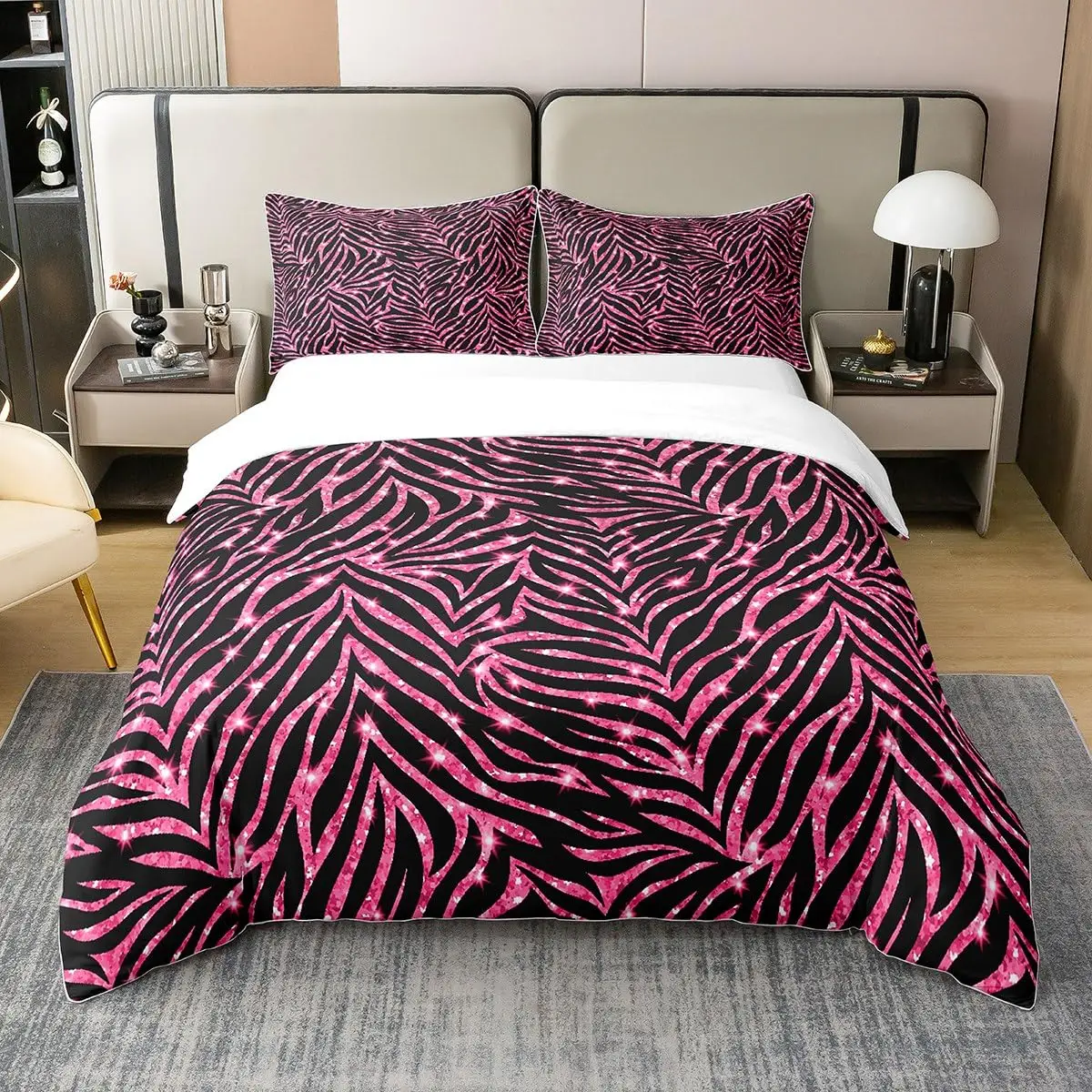 Zebra Print Bedding Set, Striped Zebra Animal Print Decorative Quilted 3 Piece Comforter Cover with 2 Pillow Shams, King Size